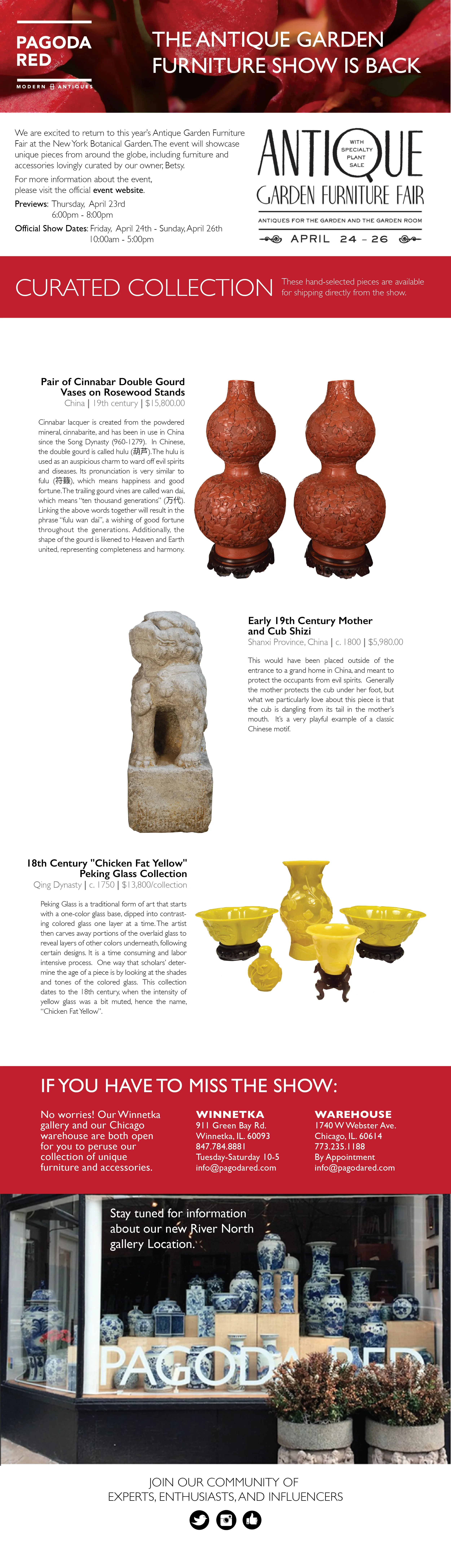 Pagoda Red is a Chicago-based gallery whose focus is curating Asian furniture and contemporary art. This email template is meant to advertise an upcoming show while also reminding subscribers that they have a new space opening soon.